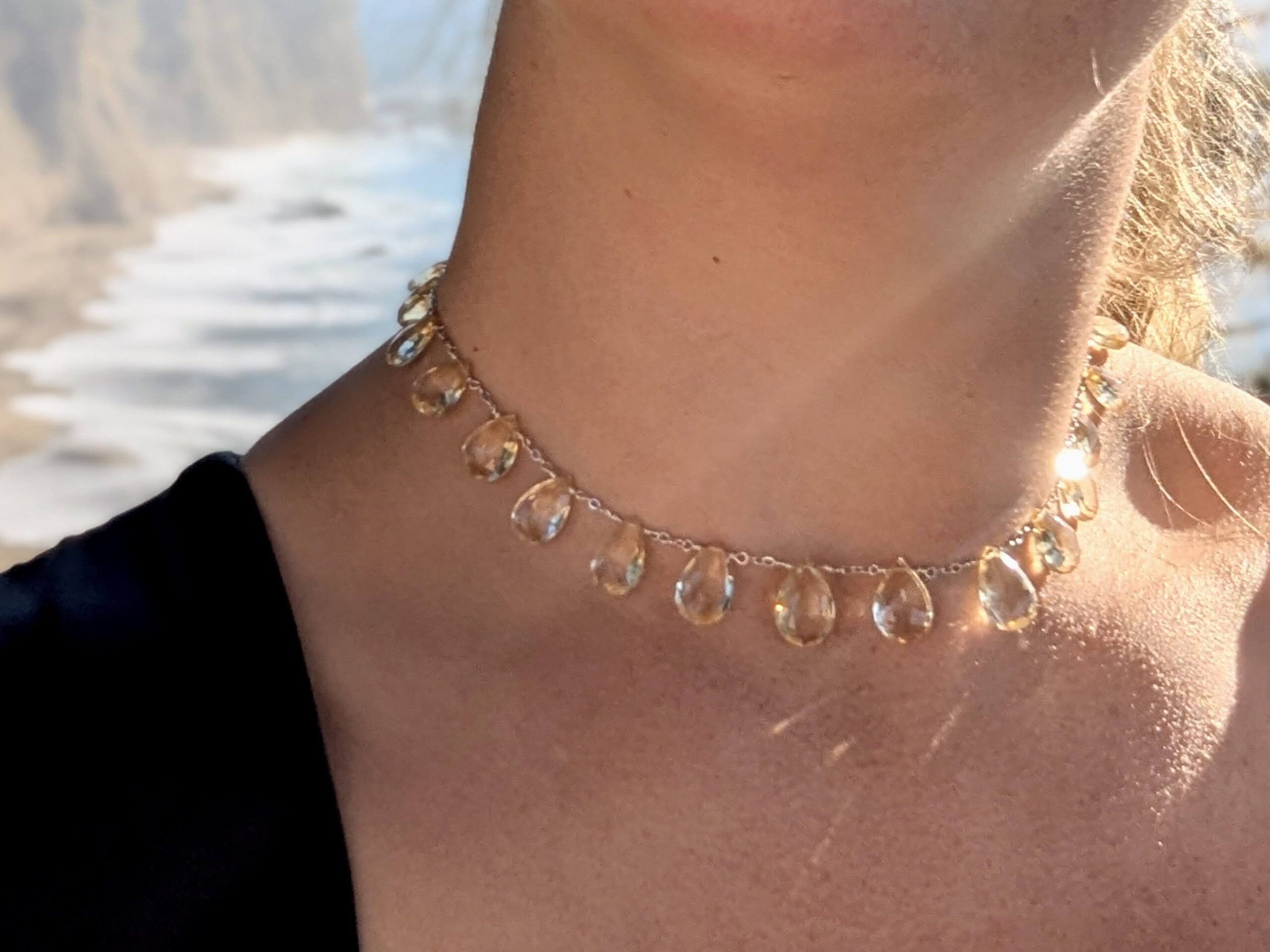 Large, ultra-high grade citrine drops encircle the neck, hand-woven into sterling silver chain. Simple and delicate, but eye-catching and magnificent at the same time, these citrines will sparkle across the room.