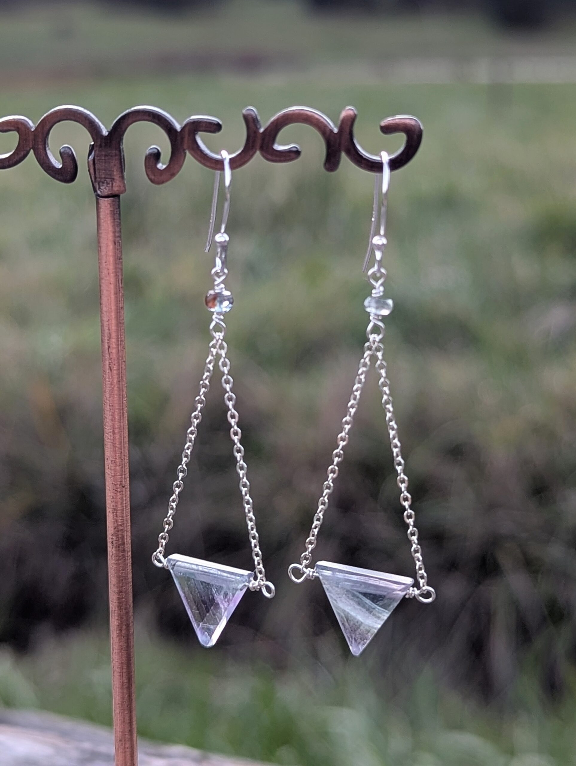 Misty pastel green/grey/purple fluorite triangles hang delicately on sterling silver chain with aquamarine. Sterling silver earring wires.