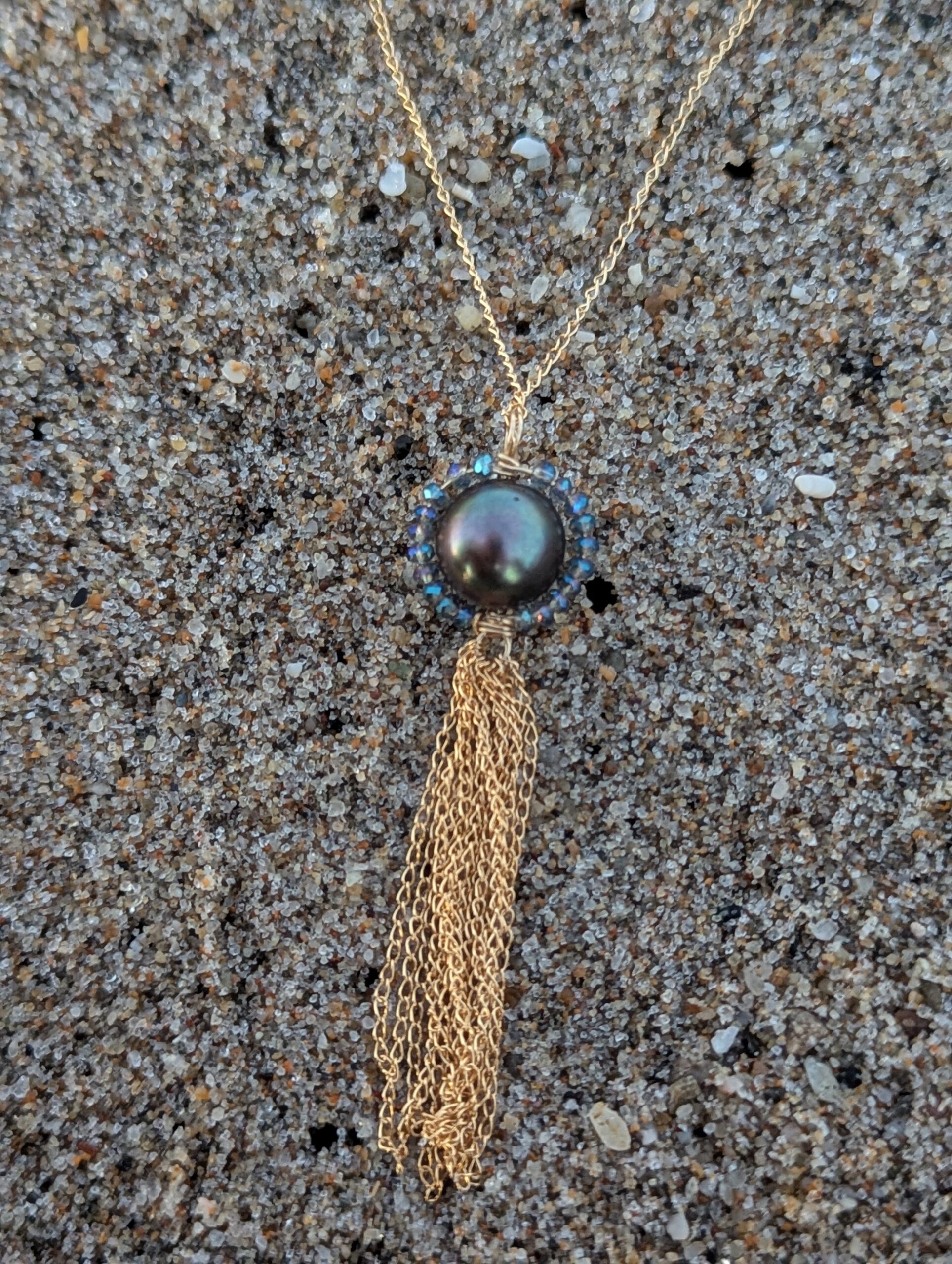 Tahitian Black Pearl with a halo of iridescent glass and a tassel of 14k gold fill chain. On a 30″ long 14k GF chain.