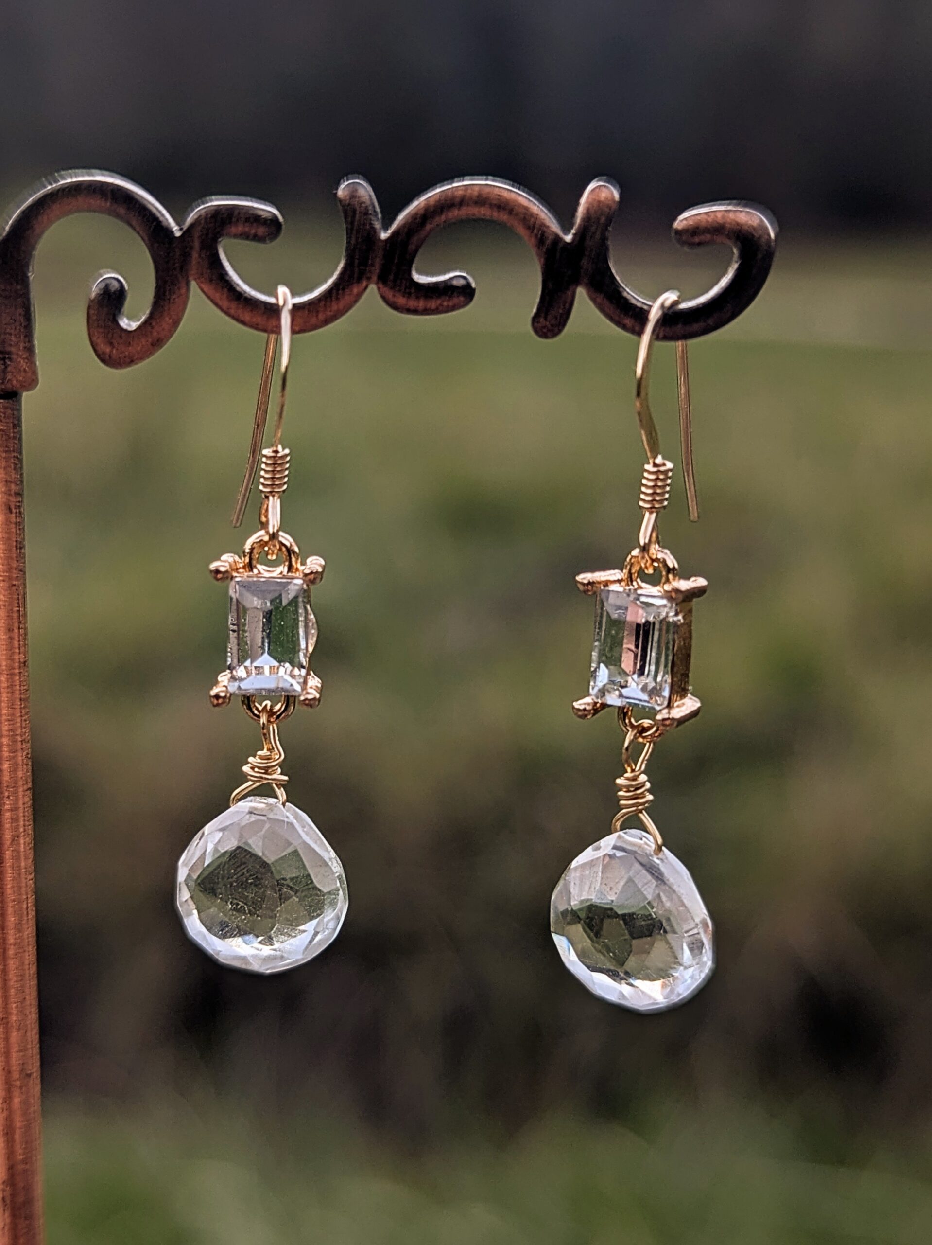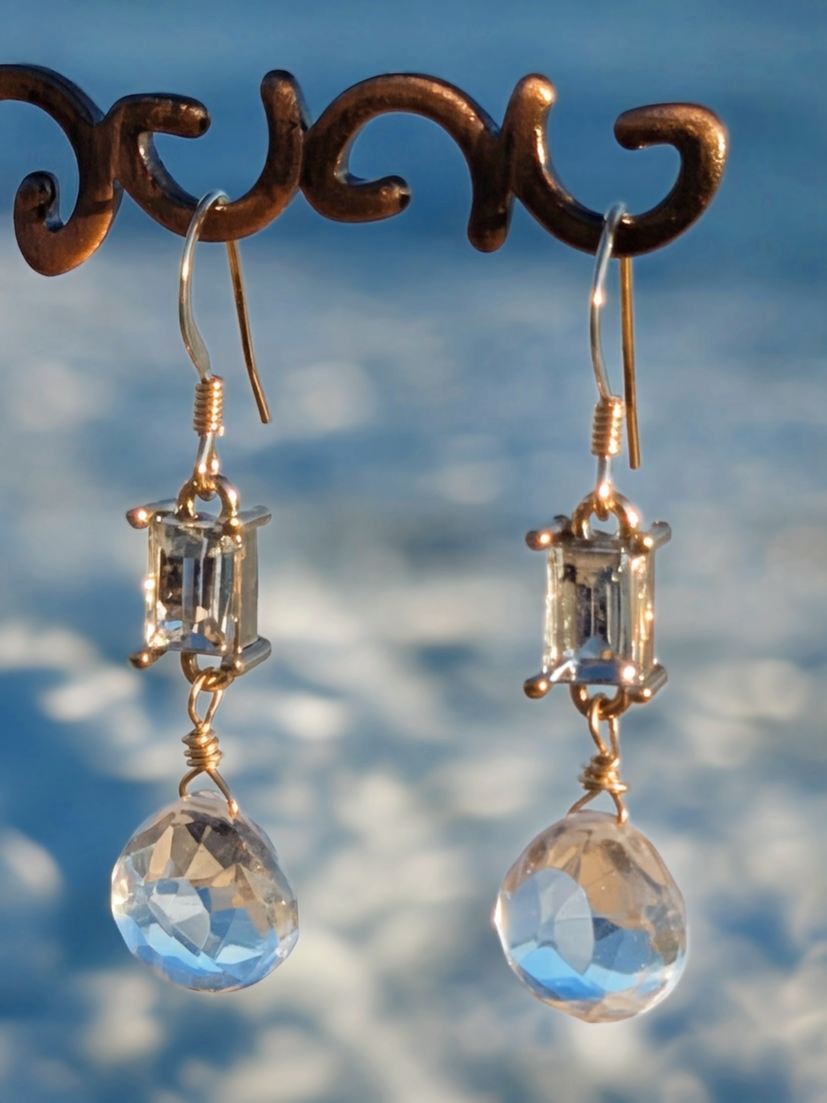 Clear quartz crystals hang from gold-set baguette CZ crystals on 14k gold fill earring wires. Timelessly beautiful and elegant, can dress up or down for any occasion.