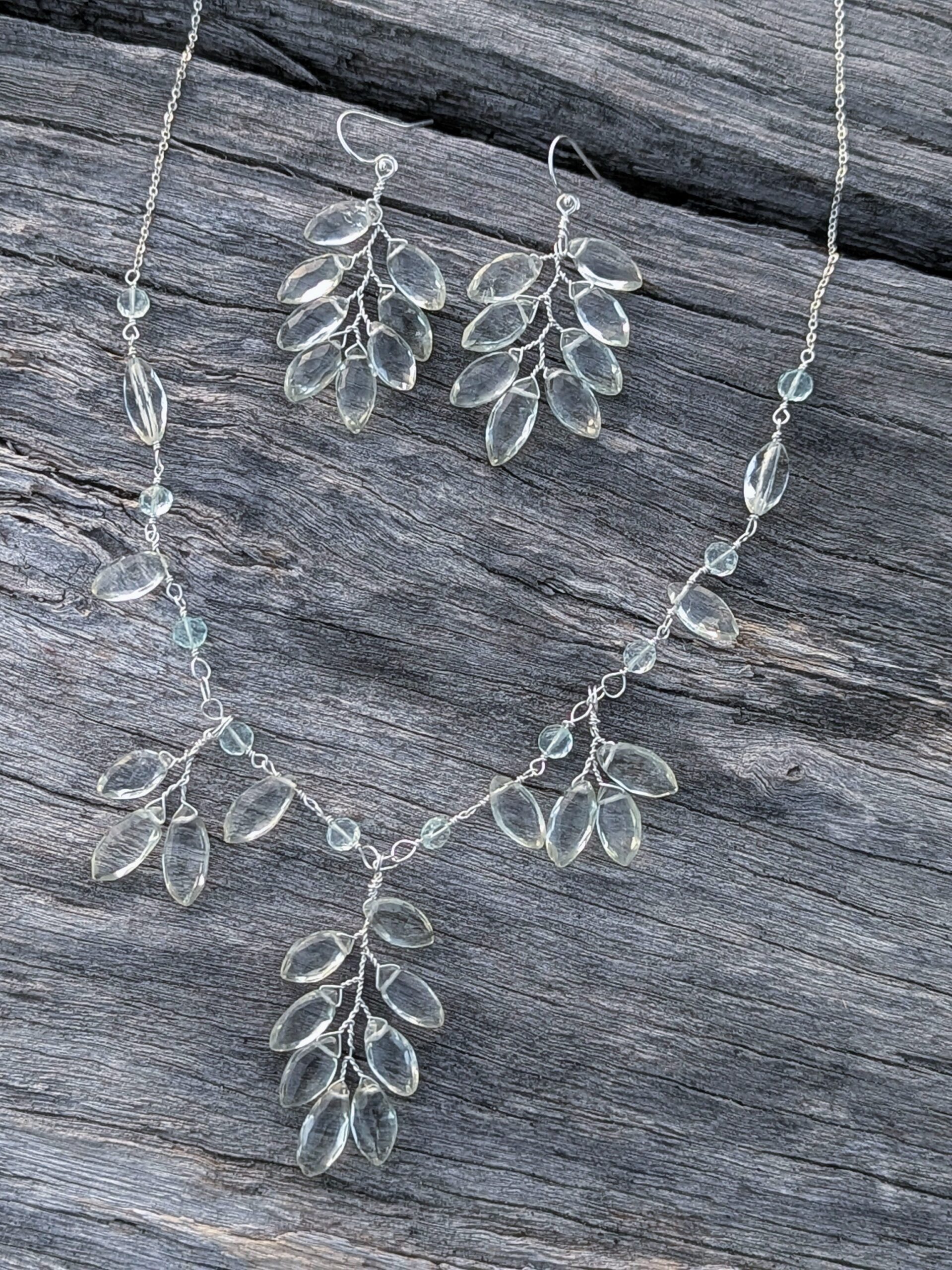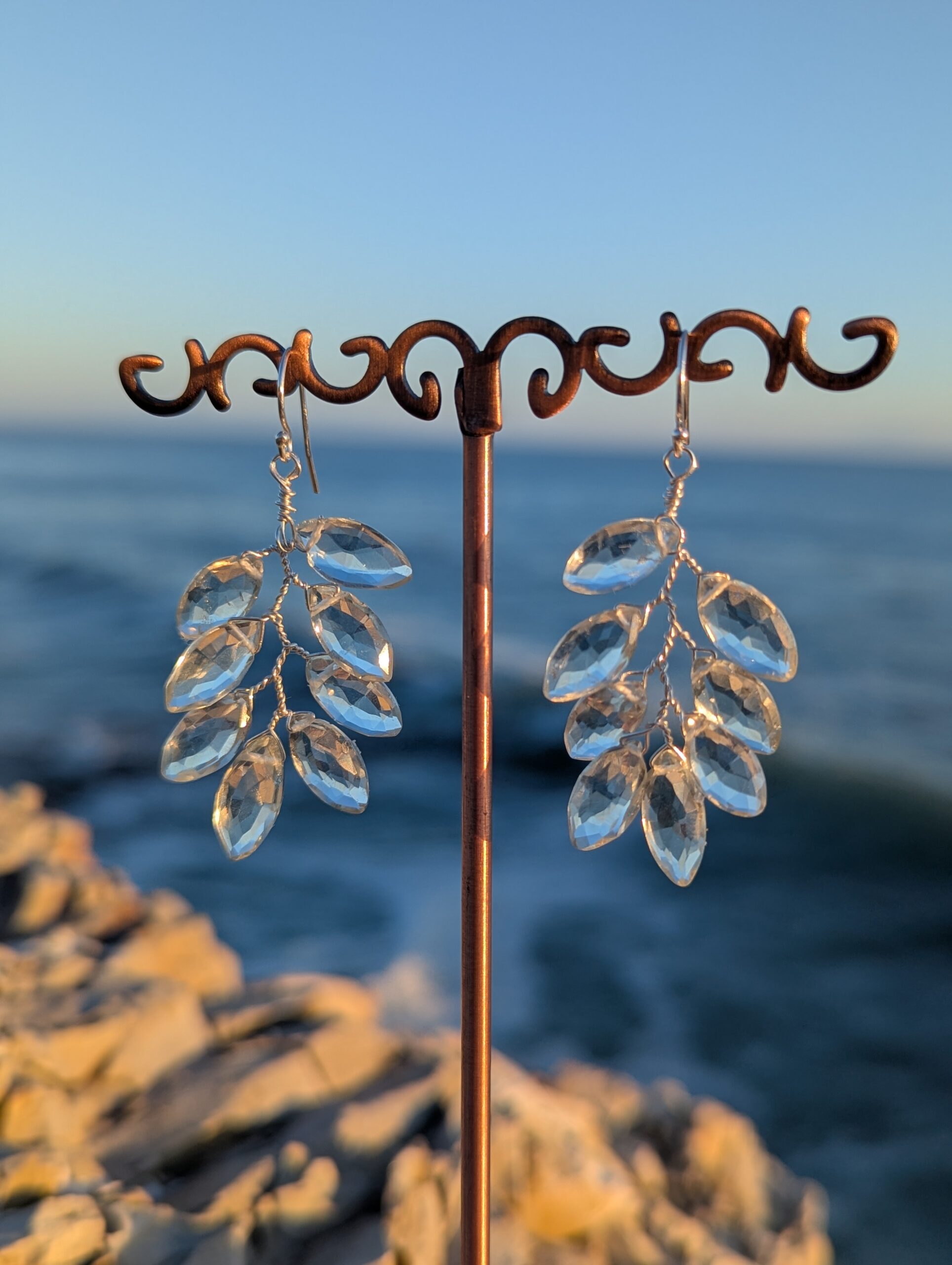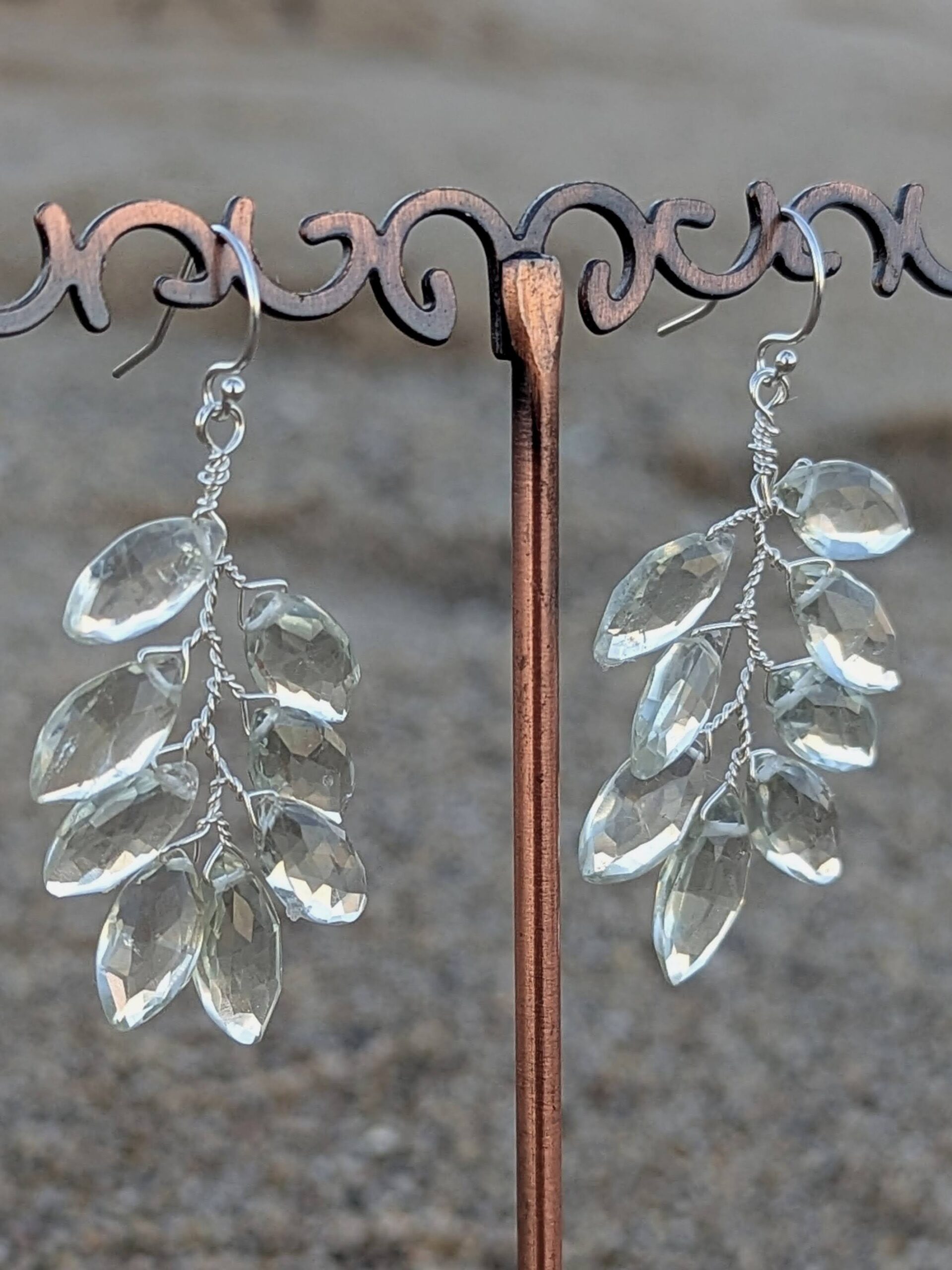 Hand-twisted clusters of leaf-shaped green amethyst. Beautifully clear and sparkly, like ice crystals. Sterling silver wire and earring wires. Note: Very delicate – please be mindful when wearing and storing.